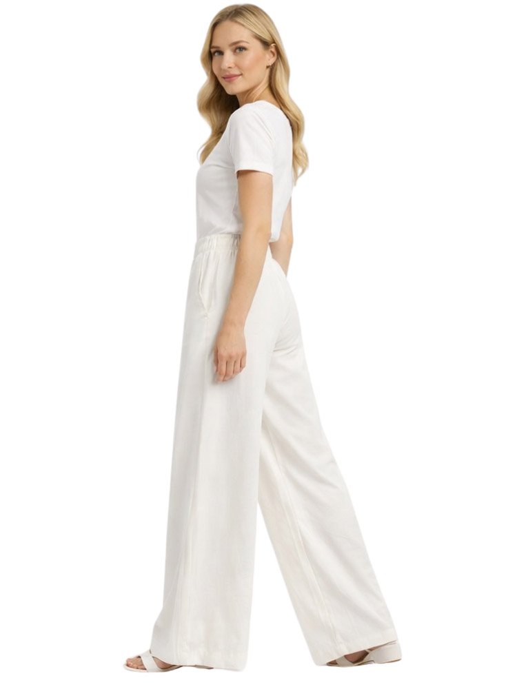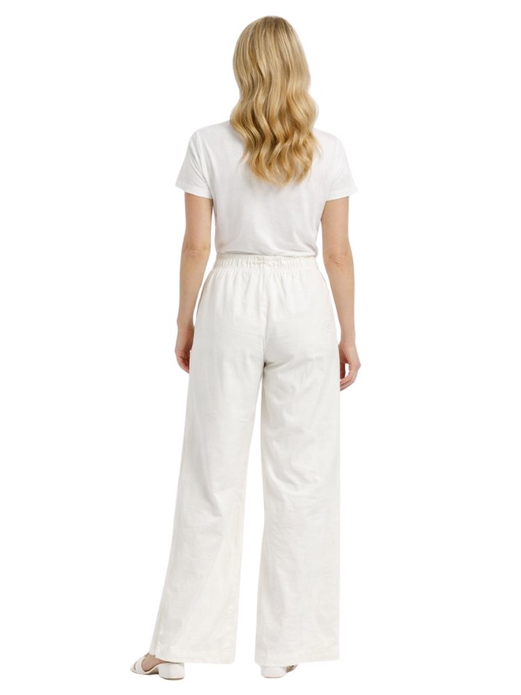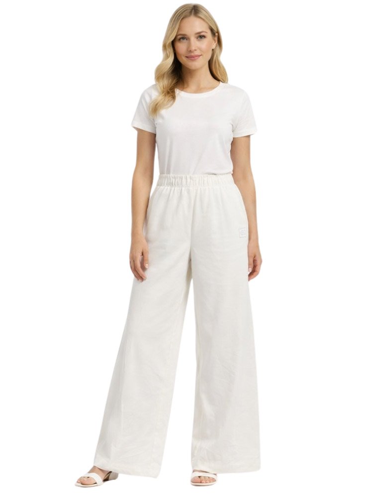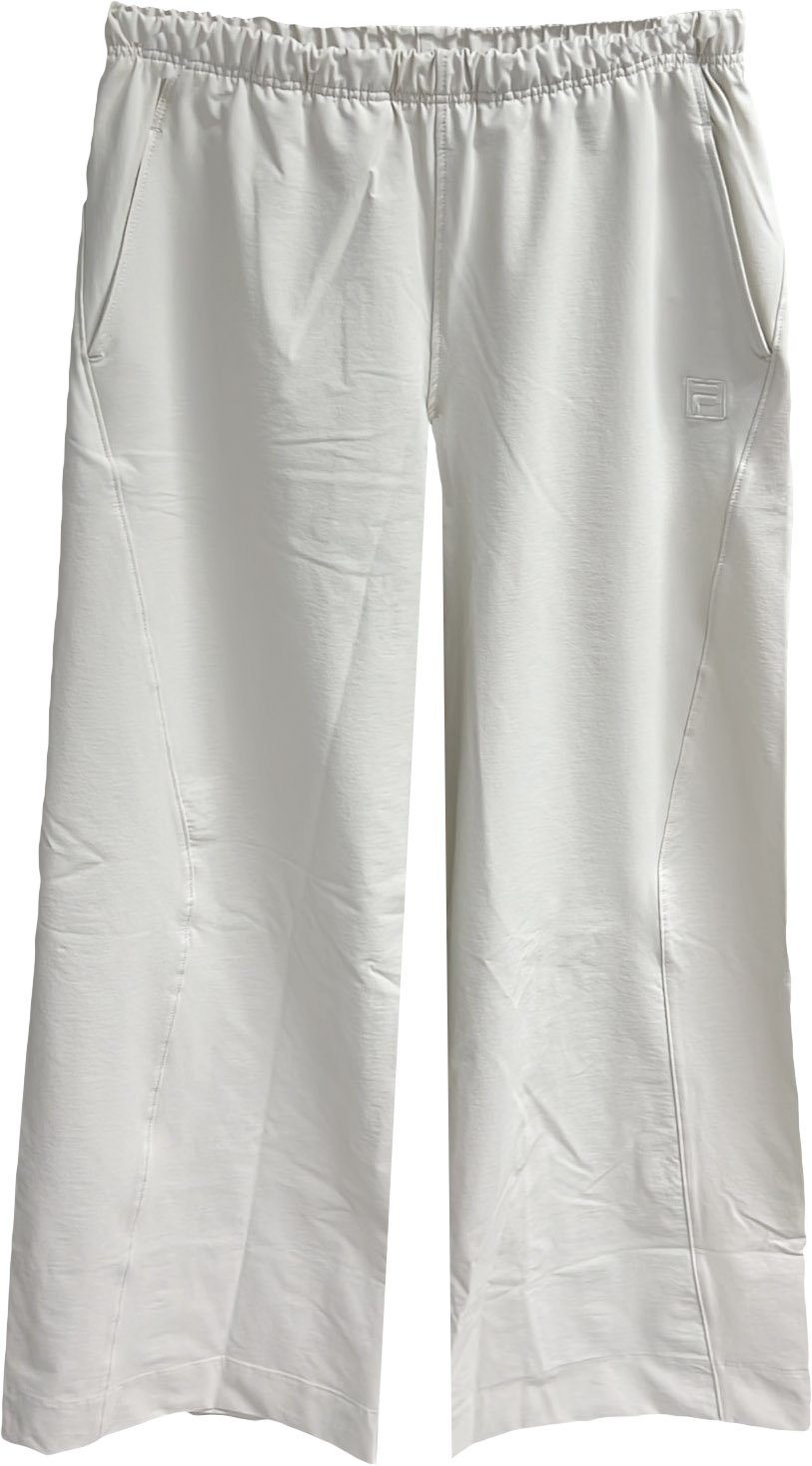 Calça Feminina Fila Wide Leg Pantalona cor Off White de modelagem larga, confeccionada em tecido plano de poliamida com elastano. Uma peça conta com a tecnologia FLOW, que garante rapidez e controle térmico. O design possui cós aplicado com elástico interno, além de bolsos faca espontâneos. As costuras laterais são deslocadas para a frente e a barra de 5 cm é finalizada com costura dupla. O F-Box monocolor em seda, aplicado abaixo do bolso esquerdo, assina a peça.