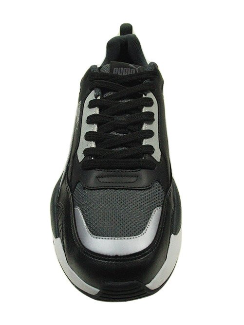 Tênis Puma, da linha X Ray 2. Modelo cano baixo super descolado, confeccionado em uma combinação de material sintético e tecido mesh na cor preta, contendo detalhes em cinza e branco. Ele possui cabedal acolchoado e palmilha SoftFoam, proporcionando maior conforto para os pés. O logo Puma aparece na língua, lateral e calcanhar do tênis. Sua vira é em EVA, solado em borracha e fechamento em cadarço.
